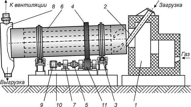 Одноходовое горизонтальное барабанное сушило для сушки песка и глины (рис. 45) состоит из топки 1, загрузочной воронки 2, барабана 6, механизма вращения печи, смонтированного на раме 10, опорного устройства 3, разгрузочной камеры 8 и вытяжной вентиляционной системы. Барабан наклонен к линии горизонта на 3¸6°, частота вращения n = 0,03¸0,15 с-1 (2¸10 об/мин). Механизм вращения барабана состоит из электродвигателя 9, редуктора 7, уравнительной муфты 5, ведущей шестерни 11 и зубчатого колеса 4. Частота вращения барабана устанавливается путем перестановки сменных шестерен. Осевое перемещение барабана ограничивается опорными роликами 3.