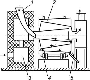Трехходовое барабанное сушило (рис. 47) состоит из топки 3, загрузочной воронки 1, трехходового барабана 2, разгрузочного желоба 5 и механизма вращения 4 барабана. Барабан 2 состоит из трех усеченных конусов различных размеров, вставленных один в другой. Благодаря такой конструкции путь перемещения материала при сушке в барабане в 3 раза больше его длины, и та же производительность, что и в одноходовых барабанных сушилах достигается при меньших габаритных размерах.