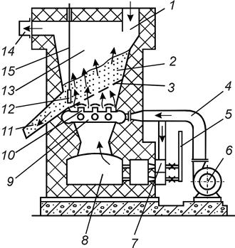 Установка представляет собой сварной вертикальный барабан, футерованный изнутри огнеупорным кирпичом, и состоит из трех камер. В камере 8 сжигается газ, в камере 9 топочные газы с температурой 1100¸1200 °C смешиваются (до температуры 400¸800 °C) с воздухом, поступающим через фурмы 10. Боковые стенки третьей камеры 13 (камера сушки) изготовляют из толстолистовой стали, а наклонную решетку 3 – из жаростойкой стали. Суммарное проходное сечение отверстий в решетке диаметром 2,5¸3 мм составляет 6¸7 % ее площади.