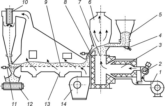 Вентилятор 1 подает воздух в газовую или мазутную горелку 2 и камеру смешения 3, где он несколько охлаждает топочные газы до 600¸800 °C. С этой температурой смесь воздуха и продуктов сгорания проходит через сопла сушильной решетки 7 в камеру сушки 6. Песок, предназначенный для сушки, транспортируется в бункер 5 сырого песка, из которого вибрационным питателем 4 равномерно подается в камеру сушки 6. Производительность вибрационного питателя можно регулировать (в весьма широких пределах) либо изменением угла его наклона, либо изменением частоты и амплитуды вибратора. Просушенный в камере 6 песок собирается в лотке 8 сушила. При соответствующей массе автоматически открывается откидной клапан, и песок поступает на решетку 9 охлаждающей камеры 13. Смесь воздуха и продуктов сгорания с температурой 50 °C выбрасывается через циклон 10 в атмосферу. В камере 13 песок охлаждается воздухом, нагнетаемым вентилятором 14, и проходит через отверстия в решетке 9. Охлажденный до температуры 30 °C песок через клапан-мигалку 11 пересыпается на ленточный конвейер 12. Топка внутри выложена огнеупорным кирпичом. Сушильная решетка 7 изготовлена из жаростойкой стали. Установка оборудована устройствами для автоматического измерения температуры газов при входе в камеру сушила, при выходе их из сушила и из охлаждающей камеры.