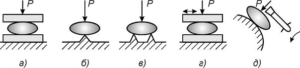 Процесс дробления осуществляется следующими способами: раздавливанием (рис. 50, а); раскалыванием (рис. 50, б); изломом (рис. 50, в); истиранием (рис. 50, г) и ударом (рис. 50, д).