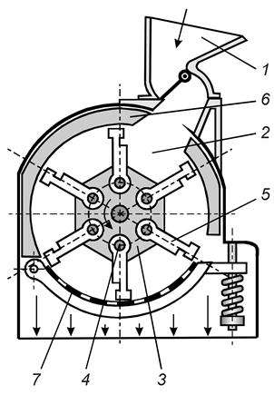 Молотковые дробилки размельчают материал под действием удара быстровращающихся молотков (бил) 5, укрепленных на роторе 3 с помощью шарниров 4 (рис. 55), а также под действием удара материала о броневые плиты 6. Куски материала, подлежащего дроблению, через загрузочный желоб 1, попадают в рабочее пространство 2 дробилки, где, подвергаясь ударам молотков 5, дробятся и просыпаются вниз через отверстия колосниковой решетки 7. Размеры продукта дробления определяются как шириной щелей в колосниковой решетке, так и величиной радиального зазора между молотками и решеткой, который равен (3¸5 мм).