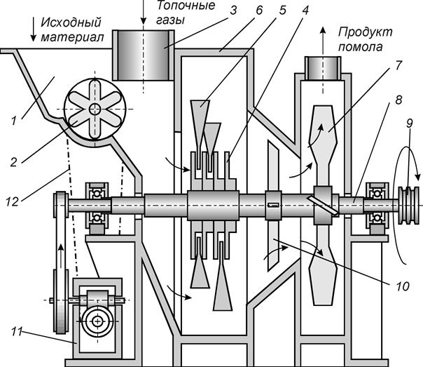 На приводном валу 8 жестко посажен ротор 4, на котором при помощи шарниров, так же как и в дробилках, подвешены в три ряда молотки 5, измельчающие материал. Измельчение происходит вследствие удара по кускам молотков и ударения кусков о броневые плиты помольной камеры 6.