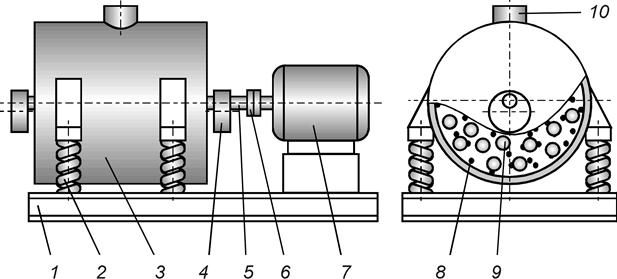 Вибрационная мельница (рис. 59) состоит из станины 1, на которой через пружинные опоры 2 установлена помольная камера 3. Привод осуществляется от электродвигателя 7 через упругую муфту 6 к валу 5 вибровозбудителя. Вибровозбудитель представляет собой вал с дебалансными дисками и может быть установлен с наружной стороны помольной камеры или внутри нее. На рисунке изображен второй вариант. При размещении вибровозбудителя внутри помольной камеры, его вал закрывается цилиндрическим кожухом.