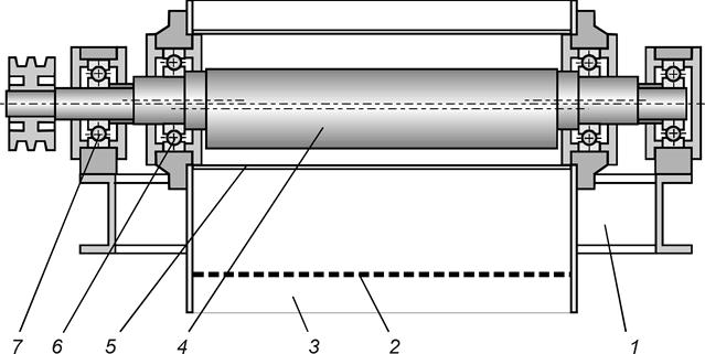 Плоское механическое сито состоит из рамы 1, корпуса 3 с закрепленными на нем решеткой 2 и эксцентриковым валом 4. Корпус 3 представляет собой жесткую сварную конструкцию, лежащую на четырех резиновых амортизаторах, которые установлены на раме. Эксцентриковый вал 4 (рис. 64) установлен в подшипниках 7, смонтированных на раме, и проходит через подшипники 6, установленные в корпусе. Чтобы исключить взаимодействие вала с просеиваемым материалом, вал закрыт цилиндром 5. Решетка 2 сита представляет собой металлический лист, в котором в шахматном порядке просверлены отверстия диаметром 10¸20 мм. Угол наклона сита регулируется в пределах 8¸14° в зависимости от количества комьев в просеиваемом материале. Это выполняется посредством перестановки на корпусе кронштейнов амортизаторов.