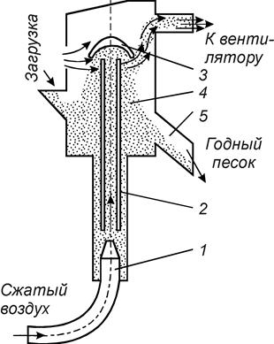 Воздух от вентилятора высокого давления подается к соплу 1, на выходе которого он приобретает высокую скорость истечения. В результате этого песок вместе с воздухом эжектируется (увлекается) в трубу 2, где его скорость еще более возрастает. Благодаря взаимному столкновению песчинок в процессе их движения по трубе 2, а также в результате удара их о конический экран 3 происходит срыв неактивной оболочки связующего с поверхности зерен песка. Частично регенерированный песок из коллектора 4 разделяется на два потока: один направляется по желобу 5 в следующую аналогичную камеру (их может быть последовательно соединено от 2 до 8), а другой в нижнюю часть коллектора 4 и опять увлекается воздухом в трубу 2. Одновременно с перетеканием песка в следующую камеру идет непрерывная загрузка не регенерированного песка.