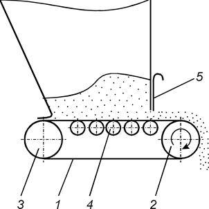 Ленточный питатель (рис. 74) состоит из ленты 1 шириной 1000¸1200 мм, приводного 2 и натяжного 3 барабанов, поддерживающих роликов 4. Такой питатель прост и надежен в эксплуатации. Количество выдаваемого материала регулируется заслонкой 5 в передней стенке бункера.