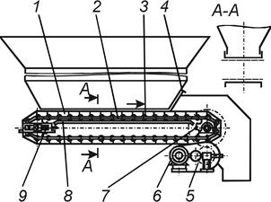 Пластинчатый питатель (рис. 75) представляет собой полотно 1, состоящее из металлических пластин. Зазоры между пластинами перекрываются, чтобы предотвратить просыпание материала. Для этого соседние пластины и борта находят друг на друга настолько, чтобы при огибании звездочки на конце питателя между ними не образовался зазор. Полотно крепится к двум тяговым цепям 2, соединенными между собой осями, с одетыми на них роликами 3. Ширина полотна 300¸1000 мм, скорость движения полотна питателей 0,10¸0,20 м/с. Количество выдаваемого материала регулируется заслонкой 4. Привод осуществляется от электродвигателя 6 через редуктор 5 к звездочке 7. Для поддержания верхней ветви питателя служат направляющие 8. Для компенсации увеличения длины цепей вследствие износа служит натяжное устройство 9.