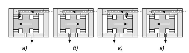 На рис. 84, а показан момент удара поршня о левую крышку. В этот момент, сжатый воздух из магистрали уже поступает в левую проточку, и, следовательно, в левую полость цилиндра. Правая полость цилиндра соединена с атмосферой. Под действием сжатого воздуха поршень начинает двигаться вправо. В некоторый момент времени впускное отверстие левой полости перекрывается буртом золотника. Подача сжатого воздуха прекращается, однако поршень по инерции движется далее (рис. 84, б). При дальнейшем ходе поршня левая полость соединяется с выхлопом, а правая отключается от атмосферы и соединяется с магистралью. Давление в правой полости начинает расти, но поршень успевает ударить о правую крышку (рис. 84, в). После удара поршень отскакивает и под действием сжатого воздуха начинает двигаться влево (рис. 84, г) и в конце пути ударяет в левую крышку. Далее цикл повторяется до тех пор, пока вибровозбудитель подключен к сети сжатого воздуха.