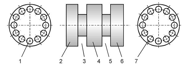 Вибровозбудитель золотникового типа представлен на рис. 84. Он состоит из цилиндра, в который помещен массивный поршень. Конструкция поршня представлена на рис. 85. На поршне выполнены две проточки 3 и 5, которые образуют цилиндрические полости, делящие поршень на три объема. В торцах крайних объемов выполнено множество сквозных отверстий 1 и 7, параллельных продольной оси поршня.
