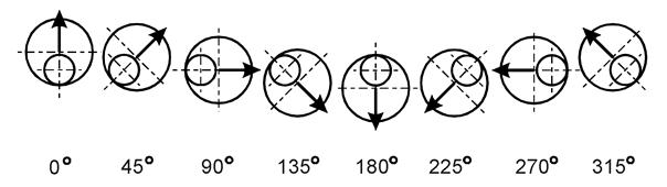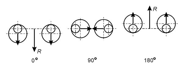 Рис. 89. Равнодействующая сил инерции при различных положениях валов двухвального вибровозбудителя