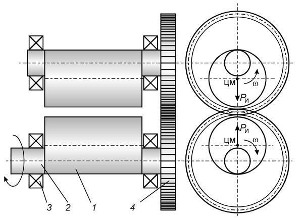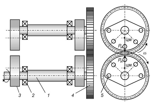 На концах вала 1, вращающегося в подшипниках 2 установлены диски 3 в виде цилиндрических секторов. Валы синхронизируются зубчатыми колесами 4. При проектировании на диске предусматривается несколько отверстий, которые при необходимости можно заполнить металлом в виде пробок. Статический момент диска в этом случае увеличивается, следовательно, увеличивается сила инерции и, соответственно, возмущающая сила вибровозбудителя.