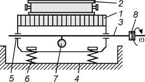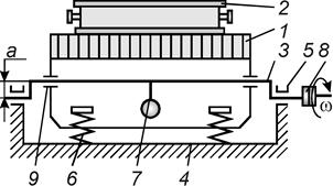 Выбивная эксцентриковая решетка (рис. 93) представляет собой корпус решетки 1, имеющий сверху рабочее полотно, на которое устанавливаются опоки 2 с выбиваемой формой. Вращающийся в подшипниках рамы 5 эксцентриковый вал 3 поднимает корпус решетки на величину эксцентриситета a. Вращение валу сообщается непосредственно от электродвигателя через муфту 8 или через клиноременную передачу. Амплитуда колебаний корпуса определяются эксцентриситетом приводного вала, а частота – его угловой скоростью. Причем амплитуда является постоянной величиной, равной эксцентриситету. Дебаланс 7, служит для динамической балансировки вала и уменьшения нагрузки на подшипники рамы.