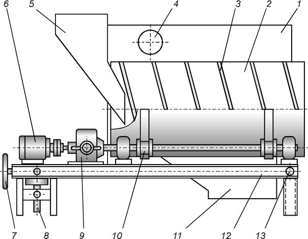 Безопочные формы сталкиваются с конвейера после охлаждения внутрь барабана через воронку 5 и разрушаются в процессе вращения барабана. Смесь проваливается через отверстия в стенке барабана в направляющую горловину 11, а отливки выходят из него и подаются далее в очистное отделение. Угол наклона барабана регулируется путем поворота его вместе с рамой 12 относительно оси 13 с помощью штурвала 7 винтового устройства 8. Этим обеспечивается необходимая скорость прохождения отливок внутри барабана и, соответственно, регулируется его производительность.