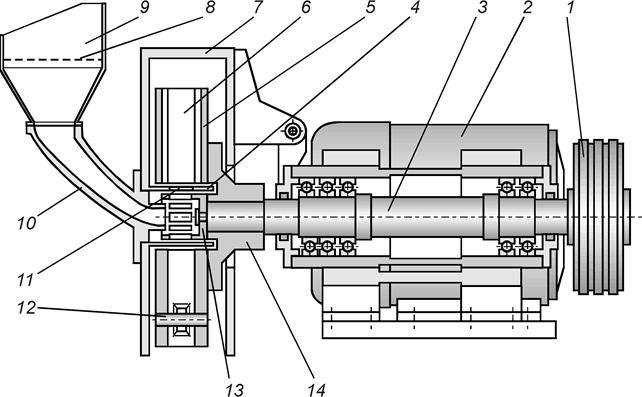 Шпиндель предназначен для передачи вращательного движения от электродвигателя 2 к ротору 5 через клиноременную передачу 1. Ротор служит для придания дроби необходимой скорости и состоит из двух дисков, радиально расположенных лопастей 6 и крыльчатки (импеллера) 13. Распределительная коробка соединена с кожухом головки и имеет окно 11, положение которого можно изменить при повороте коробки и таким образом изменить направление струи дроби при вылете из аппарата.