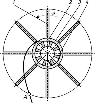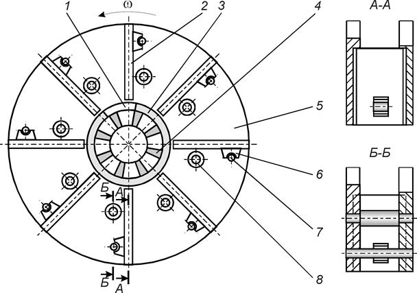 Траектория движения дроби в аппарате (рис. 109) показана жирной линией. Дробь подается в отверстие крыльчатки нагнетателя 4 и попадает между его лопатками, которые выбрасывают дробь в отверстие 2 направляющей втулки 3. Дробь подхватывается внутренним краем лопатки 1. Так как разность скоростей лопатки и дроби велика, а направления движений почти совпадают, происходит ударное взаимодействие дробинок с лопаткой и дискретный характер их движения по всей лопатке.
