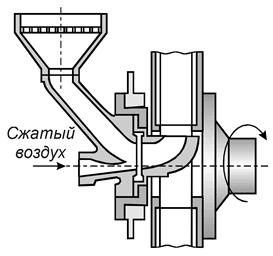 В безимпеллерных дробеметных аппаратах (рис. 111) дробь подается самотеком в направляющий патрубок, где подхватывается сжатым воздухом и вбрасывается в пространство между лопатками.