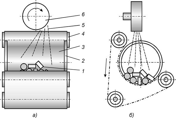 В дробеметном ленточном барабане периодического действия (рис. 112) очистка отливок осуществляется факелом дроби 5 в рабочем пространстве 1, образуемом перфорированным пластинчатым транспортером 3, охватывающим три шкива 4, и двумя торцовыми дисками 2.
