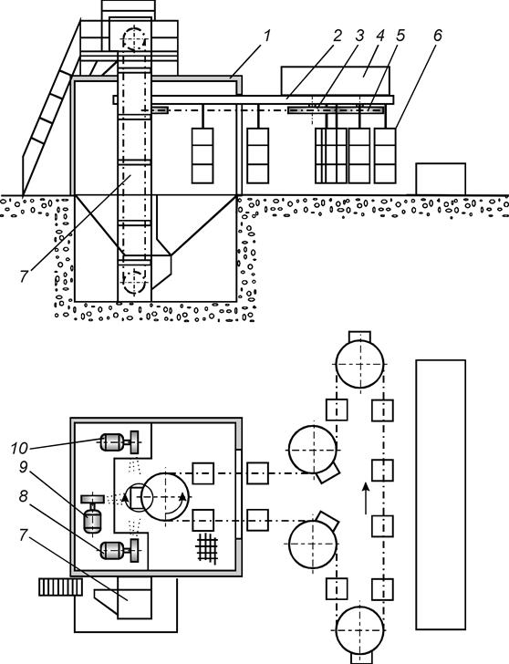 Рис. 113. Дробеметная камера непрерывного действия: 1 – камера; 2 – монорельс; 3 – звездочка; 4 – приводная и натяжная станция; 5 – приводная цепь; 6 – этажерка подвески; 7 – элеватор подъема дроби; 8, 9, 10 – дробеметные аппараты.