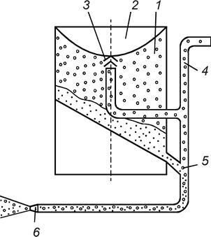 Для пополнения камеры дробью прекращают поток сжатого воздуха в полость бака и соединяют се с атмосферой. При этом клапан 3 под воздействием веса дроби опускается, и дробь из загрузочной воронки 2 попадает в полость камеры 1.