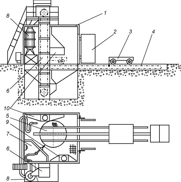 Дробеструйную очистку отливок производят в камерах по типу дробеметных (рис. 116). Такая камера представляет собой закрытую металлическую конструкцию 1, внутренняя обшивка которой выполнена из стального листа толщиной 3 мм и покрыта резиной толщиной 10 мм. В передней стенке камеры выполнен проем для ворот 2, которые открываются и закрываются автоматически или вручную. Отливки укладываются мостовым краном на тележку 3, приводимую в движение электрифицированной канатной откаткой 4. Кабина 7 камеры представляет собой изолированное рабочее помещение, на передней стене которого имеется съемное окно и сопловый механизм. Сопловый механизм смонтирован на сферическом шарнире и имеет угол поворота около 100°. Поворотный стол 5 в центре камеры предназначен для вращения тележки с отливкой при очистке. Привод поворотного стола – электромеханический. Нижняя часть камеры выполнена в виде воронки, в которой собирается дробь и продукты очистки. Шнековый питатель подает дробь и продукты очистки к элеватору 6 через вращающееся сито.