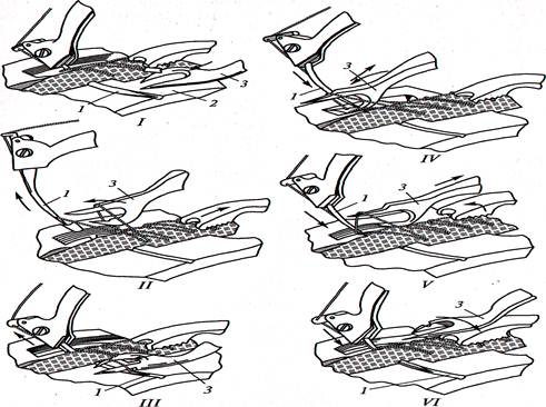 В процессе петлеобразования участвуют изогнутая игла 1 (положение I), выдавливатель и две лапки, расположенные под игольной пластиной 2, петлитель 3 и рейка (положение, II). Нажимая на педаль, работающий опускает мостик и укладывает материал на лапки лицевой стороной вниз. Лапки при этом прижимают материал к игольной пластине 3, а выдавливатель выдавливает материал в прорезь игольной пластины. Игла 1, двигаясь слева направо, прокалывает верхний материал насквозь, а нижний захватывает частично. В этот момент петлитель перемещается к работающему.