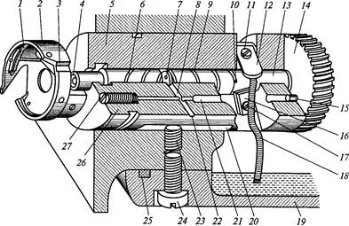 Количество масла, подаваемого челноку 2, регулируется винтом 27. Если винт 27 завинтить, то канал 8 перекроется и челнок получит более обильную смазку. Чтобы проверять подачу смазки челнока, снимают челнок 2 и к отверстию канала 4 подносят лист белой бумаги. При нормальной частоте вращения главного вала машины через 15 с на бумаге должна быть масляная полоска шириной 1... 1,5 мм.