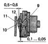 | Необходимый для вывода из челнока 1 переплетающихся ниток зазор между пальцем установочной пластины и левой стенкой паза шпуледержателя (он должен быть равен 0,5—0,6 мм) регулируется осевым смещением челнока 1 вдоль оси челночного вала 3 после ослабления двух упорных винтов. |