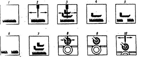 Наибольшее распространение в швейных машин нашли реечные механизмы. Но с усложнением технологических процессов потребовалось использование и других инструментов, обеспечивающих более качественное стачивание. Символы для изображения используемых инструментов, транспортирующих заготовку при шитье на машинах, показаны на рис. 1.
