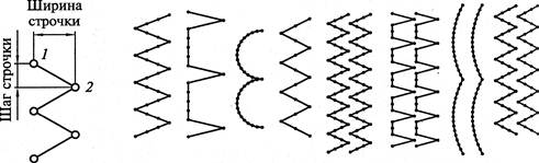 Зигзагообразная строчка, изображенная на рис.1, широко используется в швейной промышленности. Такая строчка может быть выполнена на машине челночного или цепного стежка. Зигзагообразные строчки применяются для выполнения стегальных и подшивочных работ, для пришивания кружев, аппликаций, для соединения полотен материала встык, для выполнения простейших вышивальных строчек с периодически повторяющимся узором, для изготовления петель и т.д.