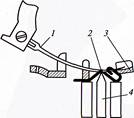 В образовании потайной строчки участвует механизм выдавливателя 4 (рис.2). Его основное назначение состоит в том, чтобы приподнимать соответствующим образом выгнутые слои материала 2 над игольной пластиной 3 так, чтобы игла 1, проколов верхний слой, только захватила нижний.