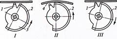 Рабочей частью выдавливателя 3 (рис. 3) является сектор 2. Зуб 1 этого сектора служит дополнительным транспортирующим устройством (положение I). При повороте сектора против часовой стрелки зуб 1 выдавливает материал и способствует его перемещению. При дальнейшем повороте (положение II) зуб выходит из зацепления с материалом, а сектор, воздействуя на материал 4, поднимает его и таким образом вдавливает в паз игольной пластины. И этот момент игла своим острием входит в материал, а выдавливатель, начинает поворачиваться в обратном направлении.