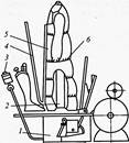 Для подогрева воздуха паровоздушный манекен имеет специальный калорифер, который крепится к основанию 1. Внутри основания манекена находится стойка 2 с отверстиями для выхода пара в период про-паривания изделия. К верхней части стойки прикреплен каркас с раздвижными плечами. Сверху на каркас надет чехол 5, в который в четырех местах вдеты шнуры 6 для регулирования объема. Объем чехла регулируется также прижимными планками 4 и системой рычагов. Паровоздушный манекен включается нажатием на кнопку 3 пульта управления. После включения через систему вентилей и влагоотделителя к манекену подается очищенный от конденсата пар, который проходит через калорифер и отверстия в стойке и заполняет чехол 5. Пар поступает под давлением 0,3...0,7 МПа, вследствие чего чехол приобретает объемную форму, близкую к внутренней форме обрабатываемого изделия. По истечении времени пропаривания включается электродвигатель вентилятора, с помощью которого под чехол нагнетается горячий воздух. Воздух проходит через калорифер, нагревается до требуемой температуры и поступает на изделие для его просушивания. Под действием горячего воздуха изделие распрямляется и высушивается. При этом удаляются ласы, а полученная деформация изделия становится устойчивой.