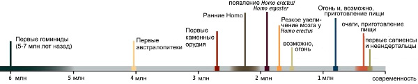 Резкое увеличение мозга у ранних архантропов традиционно связывалось с ростом потребления мясной пищи. Действительно, есть прямые археологические свидетельства того, что мясо играло заметную роль в рационе архантропов. Были они умелыми охотниками или только собирали падаль — этот вопрос активно дискутируется, но факт ос тается фактом: они действительно притаскивали на свои стоянки туши животных или их части и скребли кости своими каменными орудиями (см. подборку фактов по питанию гоминид).