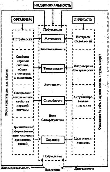 В нижеприведенной схеме организм и личность составляют единство; соответствующие компоненты — мотивация, темперамент, способности и характер — объединены системообразующими признаками: эмоциональностью, активностью, саморегуляцией и побуждениями. Примем следующие определения: