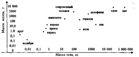 Обратимся к схеме, иллюстрирующей разброс отношения массы мозга к массе тела у человека, приматов, млекопитающих, птиц, рыб и динозавров.
