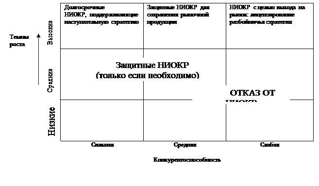 Анализ и выбор предпочтительной стратегии НИОКР для крупной многопродуктовой компании возможен на основе матрицы 3x3 темпов роста рынка и конкурентоспособности. Основные стратегические альтернативы такой матрицы показаны на рис. 15.