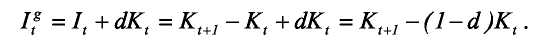 Различают валовые и чистые инвестиции. Валовые инвестиции представляют собой совокупность всех инвестиционных расходов, в то время как чистые инвестиции равны чистому приросту основного капитала. Таким образом, в чистые инвестиции не включают амортизационные расходы, то есть расходы, связанные с возмещением физически изношенного или морально устаревшего капитала. Считая, что амортизация пропорциональна имеющемуся на данный момент запасу капитала и, обозначив норму амортизации через d, получим следующее соотношение между чистыми It и валовыми Itg инвестициями периода t: