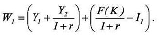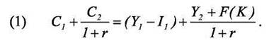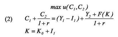 Рассмотрим двухпериодную модель для домохозяйства, как мы это делали при выборе решения о потреблении, однако введем дополнительные возможности для перераспределения ресурсов между периодами. Предположим, что часть ресурсов (I1) в первом периоде можно направить на инвестиции, которые позволят увеличить выпуск во втором периоде на величину F(K), где F(K) - производственная функция и K=K0+I1. Считая, что капитал полностью изнашивается за один период, получаем следующее бюджетное ограничение: