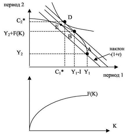 Первоначальный запас потребителя представлен на рисунке точкой A. Если бы не было возможностей для инвестирования, то потребитель выбирал бы оптимальное потребление на бюджетной линии, проходящей через точку А с наклоном, равным - (1+r), где r -реальная ставка процента. Возможность инвестирования позволяет потребителю расширить бюджетное множество. Эти возможности отражены на рисунке с помощью производственной функции F(K), которая наложена на рисунок в зеркальном отражении с началом координат в точке А. Таким образом, путем инвестирования потребитель может изменить доставшийся ему первоначальный запас, сдвинувшись вдоль кривой, отражающей производственные возможности, в любую точку левее точки А, например, в точку Е. В силу того, что ставка процента по кредитам совпадает со ставкой процента по депозитам, наклон бюджетного ограничения будет одинаков слева и справа от точки производства Соответственно в этом случае бюджетное ограничение потребителя будет представлено прямой с наклоном -(1+r), проходящей через выбранную точку (например, Е).
