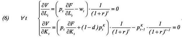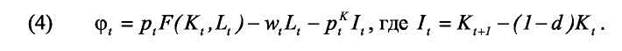 Пусть p - цена готовой продукции, pK - цена единицы инвестиционных благ, w - ставка заработной платы. Будем считать, что норма амортизации постоянна и равна d. Пусть инвестиционный лаг равняется одному периоду, то есть, инвестиции, осуществленные в период t, трансформируются в капитал и могут быть использованы в процессе производства в следующем периоде t+1. При этих условиях прибыль фирмы (до выплаты дивидендов) в период t - (φt) равна: