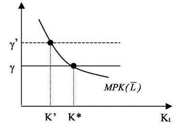 , Lt = L), тогда увеличение капитала в период t означает увеличение инвестиций. Учитывая предположение об убывании предельного продукта капитала, мы можем представить оптимальный уровень капитала K* в период t графически (смотри рисунок 2). Для простоты будем считать, что имеем дело с однопродуктовой моделью так, что условие (9) принимает вид MPK=γ. Что произойдет с оптимальным уровнем капитала, если издержки капитала (γ) возрастут? Как видно из графика, рост издержек приведет к падению оптимального уровня капитала, то есть, к сокращению инвестиций. Повышение γ приводит к тому, что отдача от дополнительной единицы капитала (MPK) не покрывает издержек γ, что влечет сокращение запаса капитала. Итак, повышение реальной процентной ставки, увеличение нормы амортизации и снижение темпа роста цен капитальных благ ведут к росту γ, а значит, к сокращению капитала и падению чистых инвестиций.