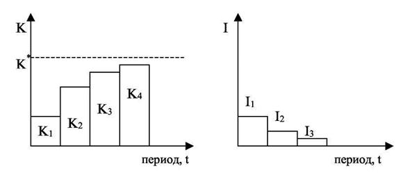 Проиллюстрируем процесс приспособления к оптимальному уровню капитала, описываемый соотношениями (15) и (16) на примере (смотри рисунок 3). Мы выбрали коэффициент приспособления λ=0.5 и изобразили динамику капитала на левом рисунке и динамику чистых инвестиций - на правом рисунке.