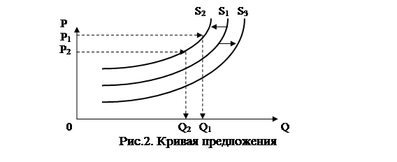 Все факторы, кроме цены данного товара, изменяют функцию предложения, что графически иллюстрируется сдвигом кривой предложения в пространстве. Уменьшение самого предложения – влево-вверх (S1 → S2); увеличение – вправо-вниз (S1 → S3).