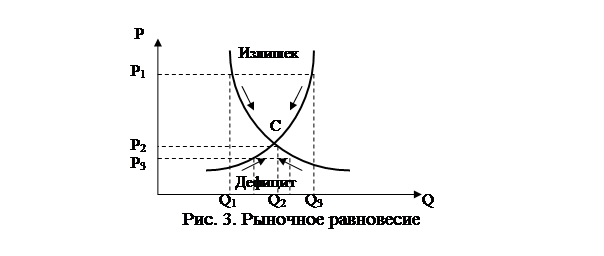 Таким образом, равновесной цене присуща уравновешивающая функция. Для графического определения равновесных показателей совместим кривые спроса и предложения на одном графике (рис. 3).
