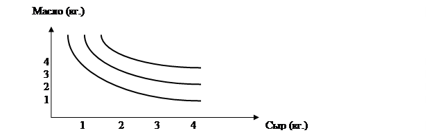 1) Кривые безразличия (их называют еще кривыми равных полезностей) показывают все комбинации потребления (например, двух продуктов: масла и сыра), которые имеют для потребителя одинаковую (равную) совокупную полезность. Потребителю все равно (безразлично) поэтому какая комбинация – они равноценны по полезности.