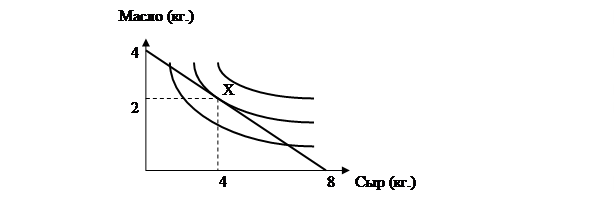 Эта точка должна быть точкой пересечения кривой безразличия и бюджетной линии. Очевидно, это будет точка Х на рис. 8. Для этого, соблюдая масштаб, перенесем на один график и кривую безразличия и бюджетную линию. Мы остановимся на точке Х, где бюджетная линия является касательной к кривой безразличия. Мы купим 2 кг. масла и 4 кг. сыра.