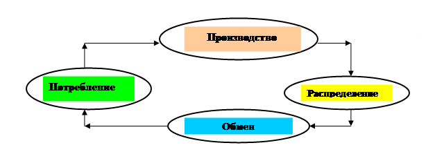 Процесс производства совершает кругооборот движения, который подразделяется на четыре стадии: производство; распределение; обмен и потребление.