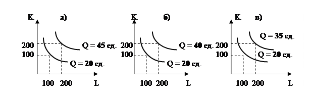 Рис. 15: а – положительный эффект роста масштаба; б) – постоянный эффект роста масштаба; в – отрицательный эффект роста масштаба.
