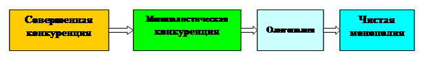 Различия между чистой конкуренцией, чистой монополией и монополистической конкуренцией весьма значительны. Для монополистической конкуренции, в частности, с одной стороны, не требуется присутствия сотен или тысяч фирм как при чистой конкуренции. С другой стороны, этот рынок представлен достаточно большим количеством фирм, а не одной как в условиях чистой монополии или несколькими фирмами как в условиях олигополии. Таким образом, и по названию, и по сути, монополистическая конкуренция занимает промежуточное положение между чистой конкуренцией, с одной стороны, и олигополией с чистой монополией, с другой стороны (рис.36)